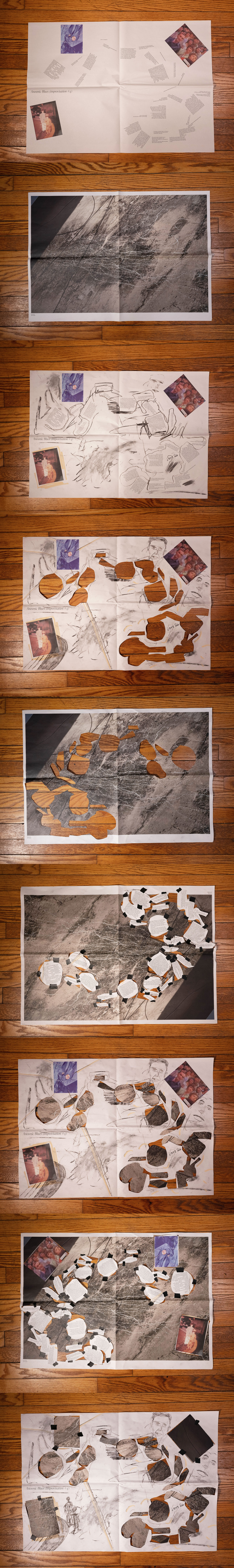 Decided to thoughtfully destroy Anosmic Blues. Body urged me to respond to the work in a physical way. It felt right. Description mentioned sharp objects, so grabbed an Exacto knife and cutting mat. Turned on the microphone that sits next to my laptop. Decided to draw some faces in vine charcoal, inspired by the images near them. Decided to make a cup of tea. Began reading the fragments of text out loud, one by one. Certain phrases felt nice to speak. Tried speaking them loudly. Tried whispering. Repeated them.Tried typing them into Google. Watched for search results. Spoke search results out loud. Some were strange. Began cutting sections of text out from the page. Circles felt right. Messy circles, like rocks. Texted Hugo, “yo is this a song” referring to the phrase in his text, “a list of things that quicken the heart”. He said “it’s a quote from Chris Marker’s Sans Soleil”. Googled that. Recorded the first words of the film. I think they are in French. Next, searched Youtube for “a list of things that quicken the heart”. Found a song by someone called “I Am Robot And Proud”. Recorded the song. Continued cutting circles out of the page. Found black tape under my desk. Thought about memory. Thought about holes in my memory. Thought about slugs. Thought about slug goo plugging the holes in my memory. Began rearranging the circles of text. Taped them in the holes they might fit in, like fitting pieces into a puzzle. I am bad at puzzles. Began realizing that my hole choices were incorrect. Committed to my incorrectness. Kept taping.Taped them all inside out. Cut out the photographs. Taped them inside out too. Looked at the page, the side where words stick out from rocks. Flipped it. Looked at the page where rocks stick out from no words. Unsure which side to favor. Set it on the floor beside my desk. Stopped recording. Played back sound. Cut out sound fragments. Mixed them together. Used the song. Felt grateful. Thank you Hugo Gallo. Thank you “I Am Robot And Proud”. Thank you Image Text Ithaca. Hung the page on my wall, rock-circles-side out, with the intention of flipping it soon.
